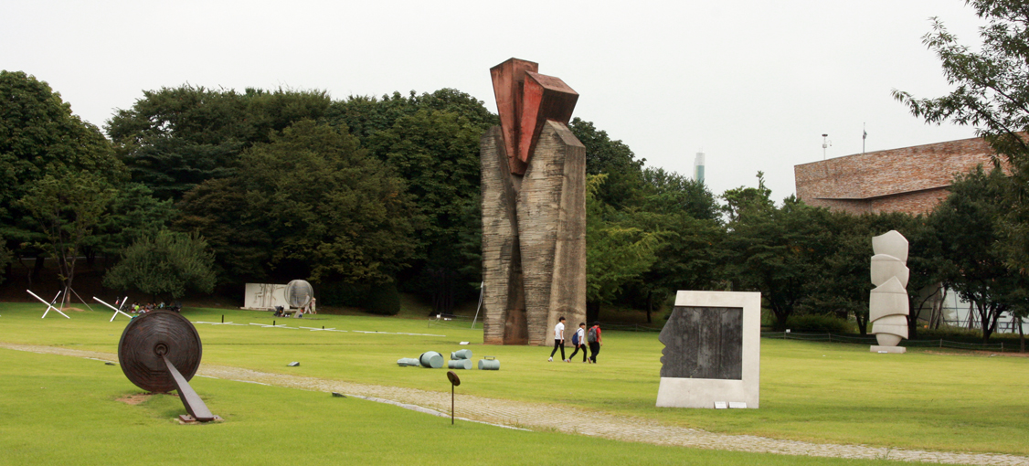 길이 잔디 사이로 났을까, 잔디가 길 사이로 났을까. 바람결에 너울대는 초록 융단을, 우뚝 선 조각들이 굽어보고 있다.
