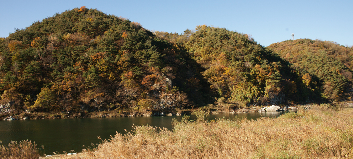흔들리는 억새 사이로 녹음이 짙은 강이 흐르고 있어