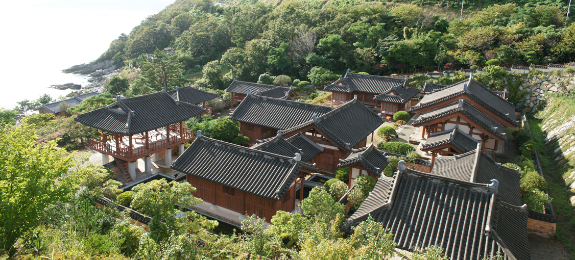 나무가 덮인 바위와 이끼가 덮인 바위가 만났다. 비견할 수 없는 두 아름다움이 서로를 마주보고 있다.