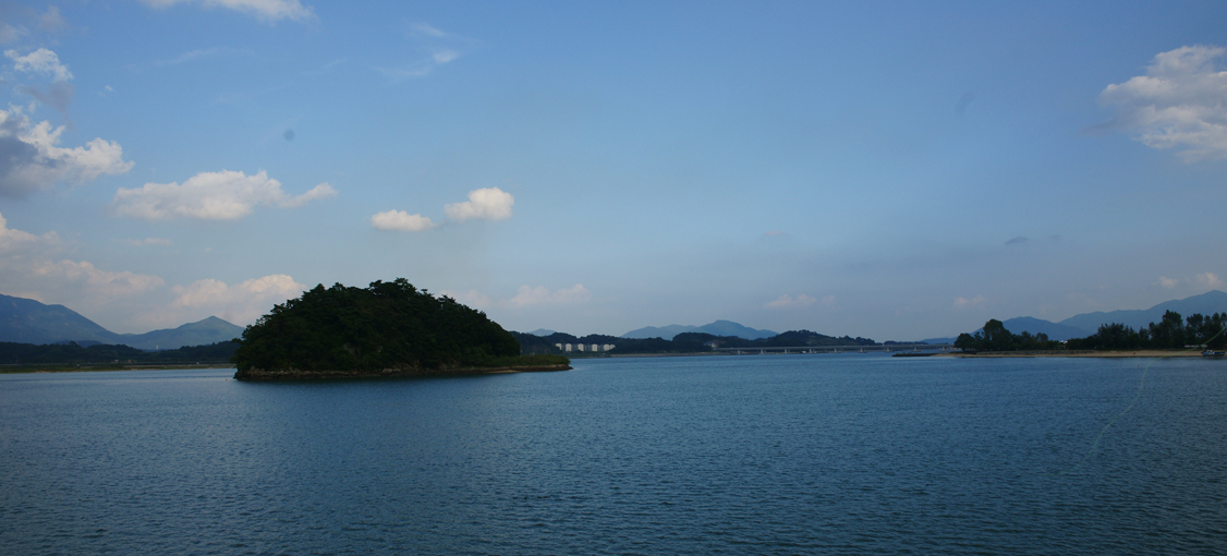 수면 위로 머리를 내민 섬이 조용히 헤엄쳐 오고 있다.