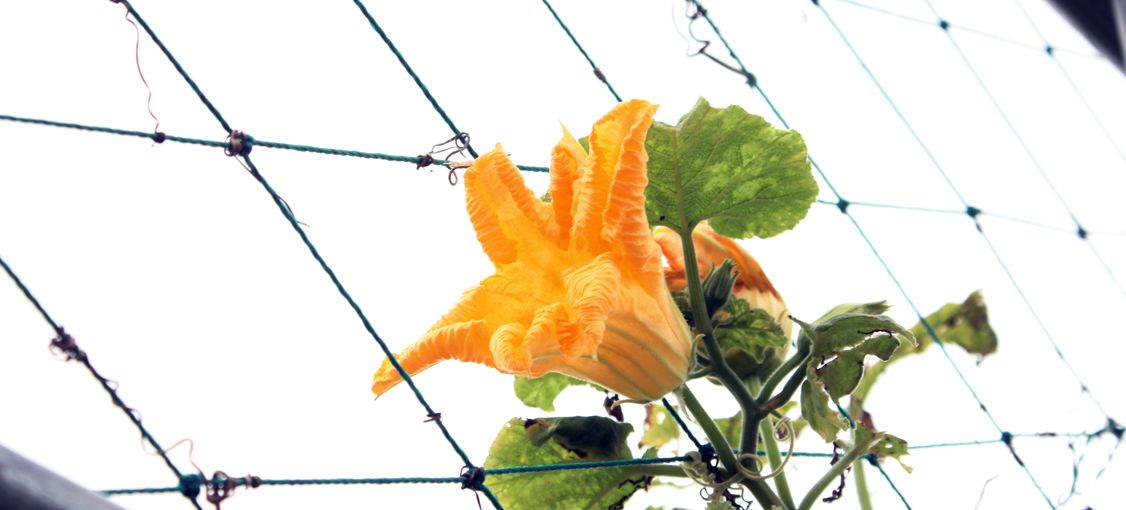 철조망 사이로 고개를 내민 노오란 호박 꽃 하나. 호박의 속살처럼 노란 꽃잎에 주름이 자글자글하다.