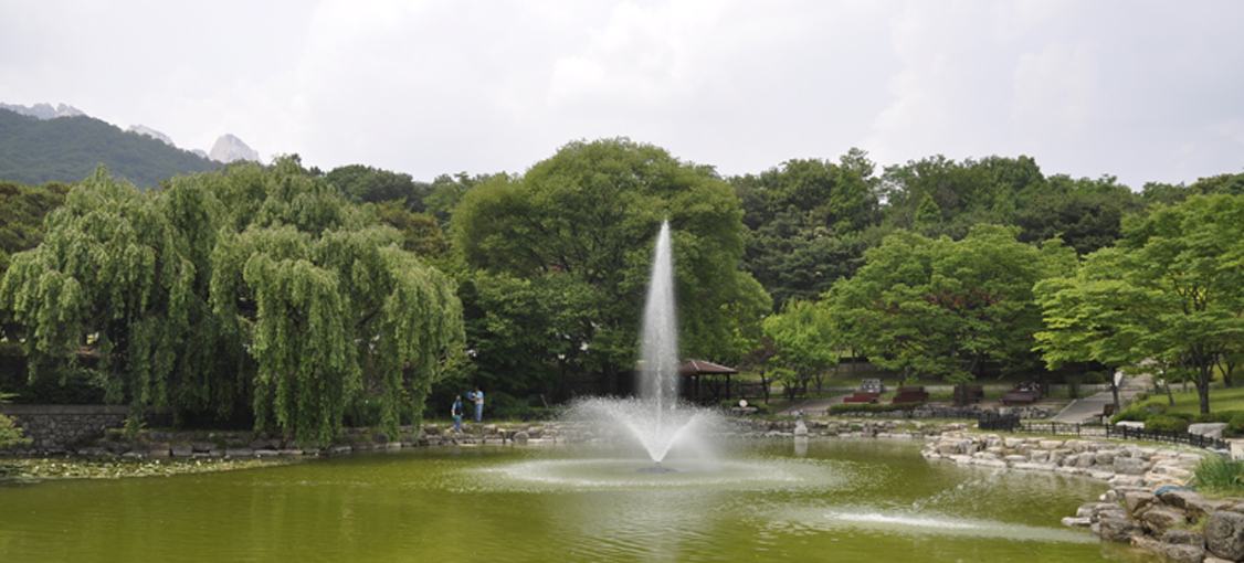 늘어진 나무 잎사귀에서 번졌나, 못에 녹음이 만연하다. 그래도 여전히 너를 푸르다라고 말할 수 있어 좋다.