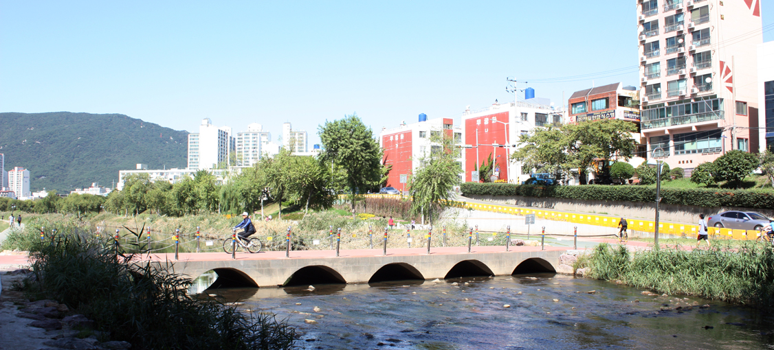 하천 위에 난 작은 다리 위로 한가로이 자전거 한 대가 지나간다. 저쪽에서 이쪽으로, 다리가 있으니 건널 수밖에 없다는 듯.